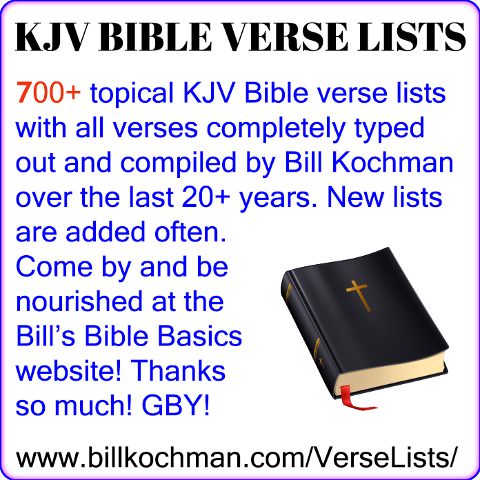 A treasure of God’s Word, topically and alphabetically arranged, awaits you on the Bill’s Bible Basics website. Personally compiled by Bill Kochman over many years, you can use these verse lists as daily or weekly personal Bible studies. You can even share them with your friends. Feel free to also include them in your own work. Of course, a link back to the Bill’s Bible Basics website would be greatly appreciated. So what are you waiting for? Dig in to the wonders of God’s Word, and be inspired, strengthened, nourished and motivated!