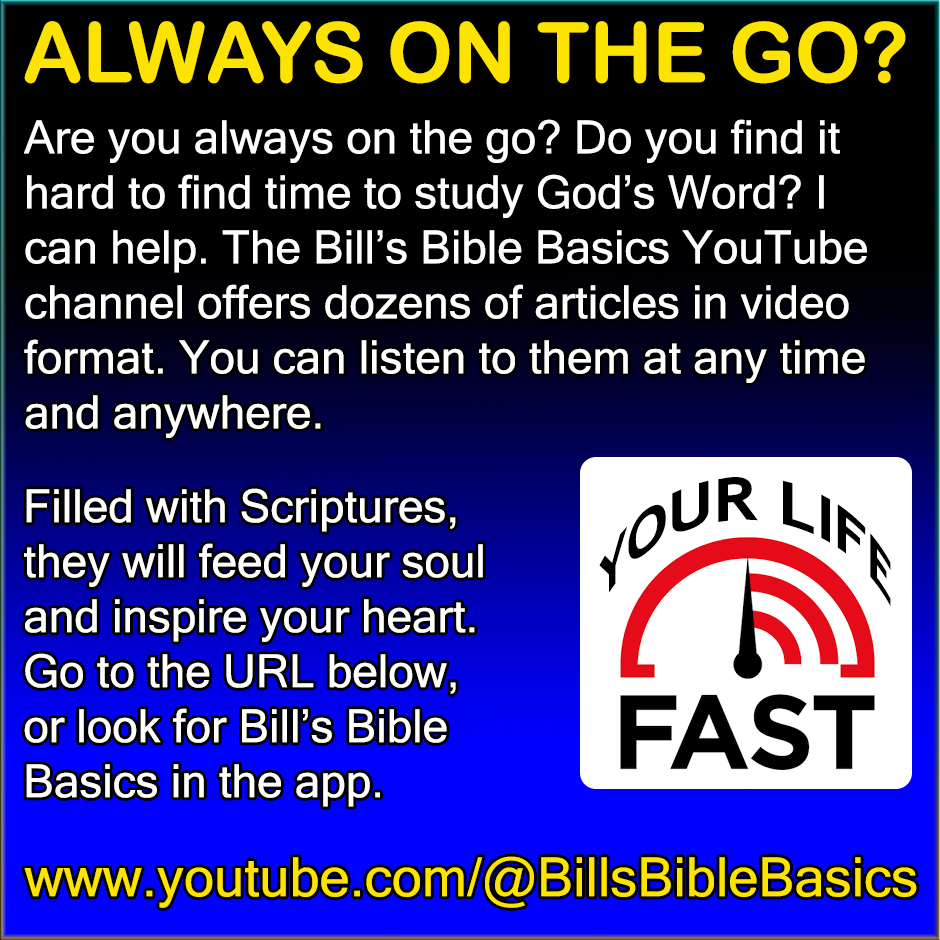 Are you always on the go? Do you find it hard to find time to study God’s Word? I can help. The Bill’s Bible Basics YouTube channel offers dozens of articles in video format. You can listen to them at any time and anywhere. Filled with Scriptures, they will feed your soul and inspire your heart.