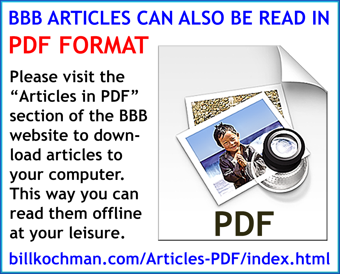 If you have a limited Internet account and have to watch your pennies, consider visiting the PDF section of the Bill’s Bible Basics website. Instead of reading the BBB articles online — and spending more of your money — you can download all BBB articles in PDF format and read them offline at your leisure. Just click or tap on the link below: