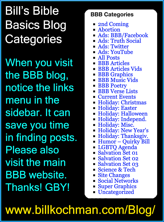 Whenever you visit the Bill’s Bible Basics Blog, please take notice of the “BBB Categories” menu that is located in the right-hand sidebar. Using this menu may save you some time in finding things on the blog. However, if you want to find all articles, KJV Bible Verse Lists, poems and graphics listed by category and in an ordered list, please also visit the following areas of the Bill’s Bible Basics website. It will be even quicker to find things this way: