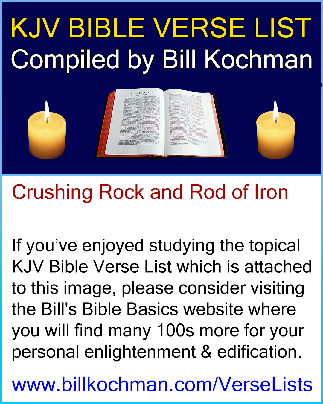 If you would like more info regarding the origin of these KJV Bible verse lists, go to https://www.billkochman.com/VerseLists/. Thank-you!