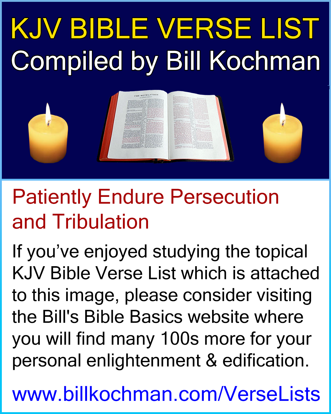 If you would like more info regarding the origin of these KJV Bible verse lists, go to https://www.billkochman.com/VerseLists/. Thank-you!