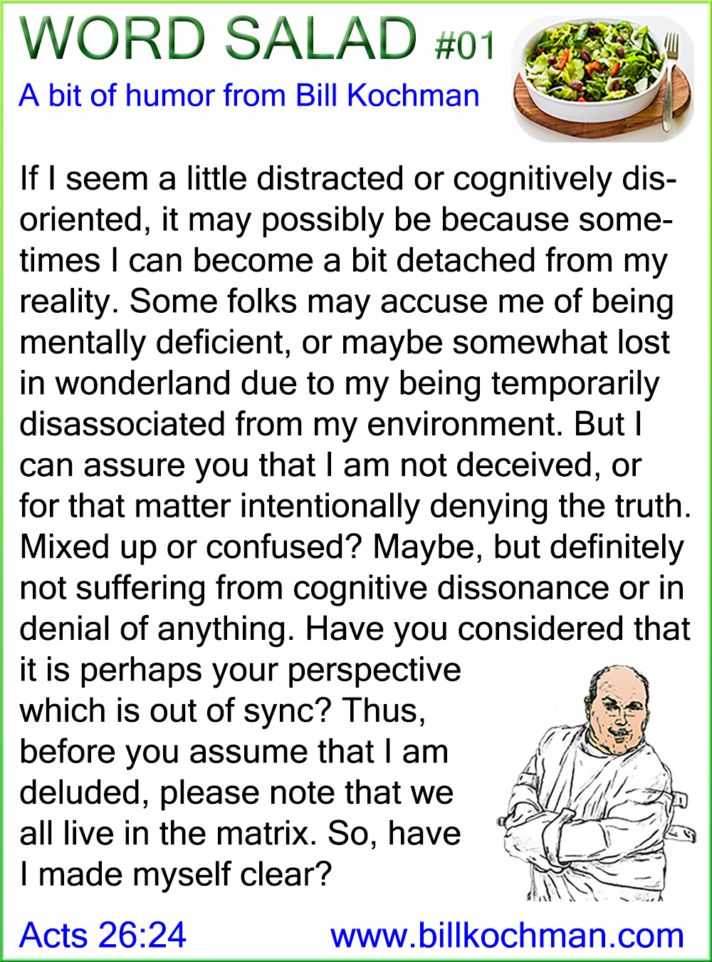 If I seem a little distracted or cognitively disoriented, it may possibly be because sometimes I can become a bit detached from my reality. Some folks may accuse me of being mentally deficient, or maybe somewhat lost in wonderland due to my being temporarily disassociated from my environment. But I can assure you that I am not deceived, or for that matter intentionally denying the truth. Mixed up or confused? Maybe, but definitely not suffering from cognitive dissonance or in denial of anything. Have you considered that it is perhaps your perspective which is out of sync? Thus, before you assume that I am deluded, please note that we all live in the matrix. So, have I made myself clear?