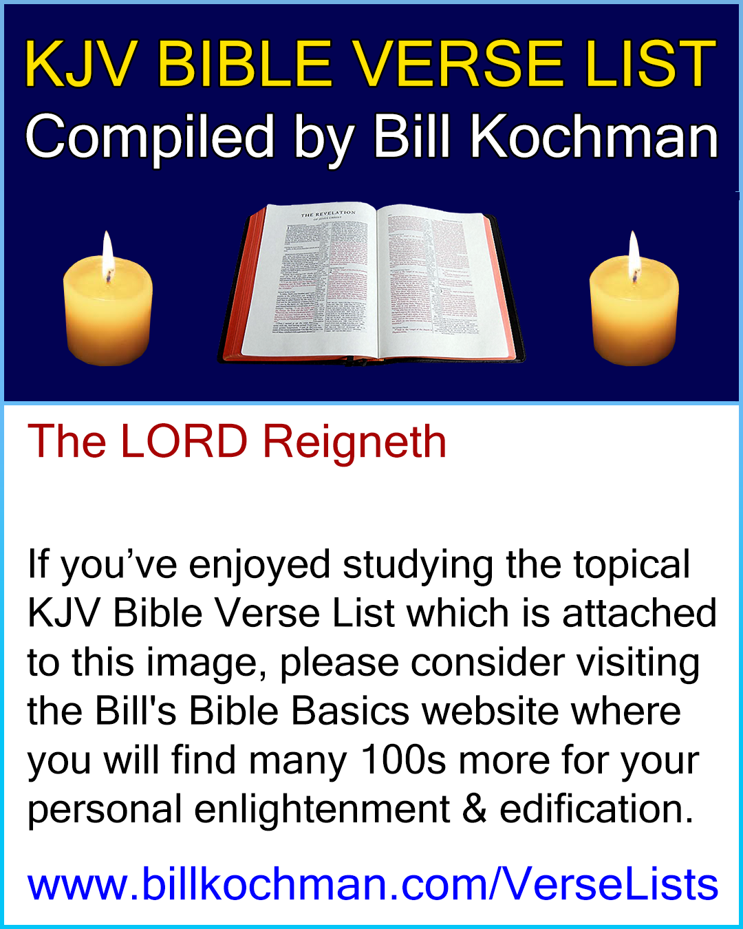 If you would like more info regarding the origin of these KJV Bible verse lists, go to https://www.billkochman.com/VerseLists/. Thank-you!