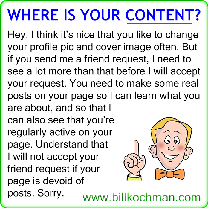 Hey, I think it is really great that you like to frequently change your profile pic and your cover image. It makes your page more interesting. However, if you decide to send me a friend request, well, I need to see a lot more than constant cover image and profile pic updates on your timeline before I will seriously consider accepting your friend request. In other words, you need to make some actual posts where you share your faith and your views, so that I can learn more regarding what you are about. This also demonstrates to me that you are regularly active on your timeline. Having said that, please understand that I will not accept your friend request if your timeline is devoid of actual posts. Sorry.